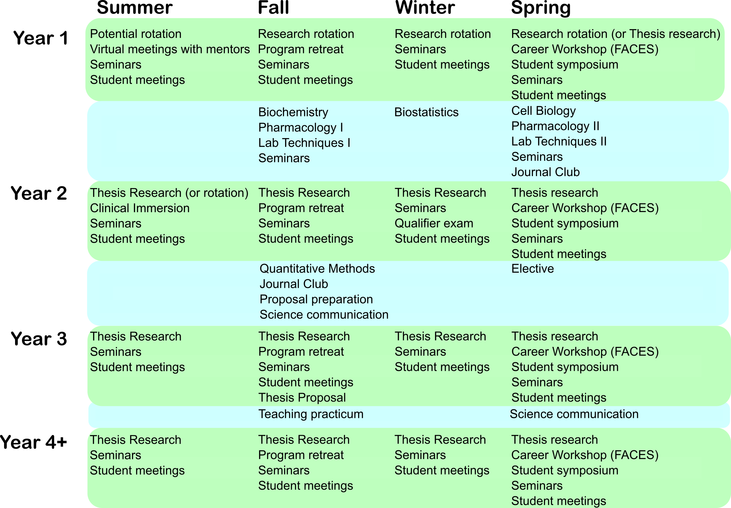 Program rules and guidelines can be found in the rules and policies booklet. Please also see the separate pages containing expanded guidelines for the Qualifier Exam and Thesis Proposal, as well as the FAQ page with general questions about the program, registration, etc.  The expected timeline for students is found in the graphic below.  Remember that the program (upon Steering Committee approval) can grant exceptions to all deadlines and requirements and, when reasonable, will be flexible to accomodate your specific circumstances.