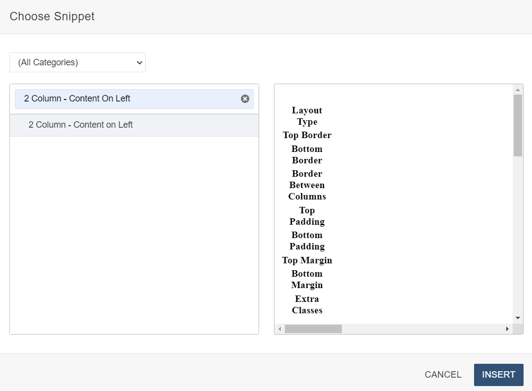 2. Click on category drop down and find "Page Layouts", or simply type in "2 Column - Content On Left" to filter.