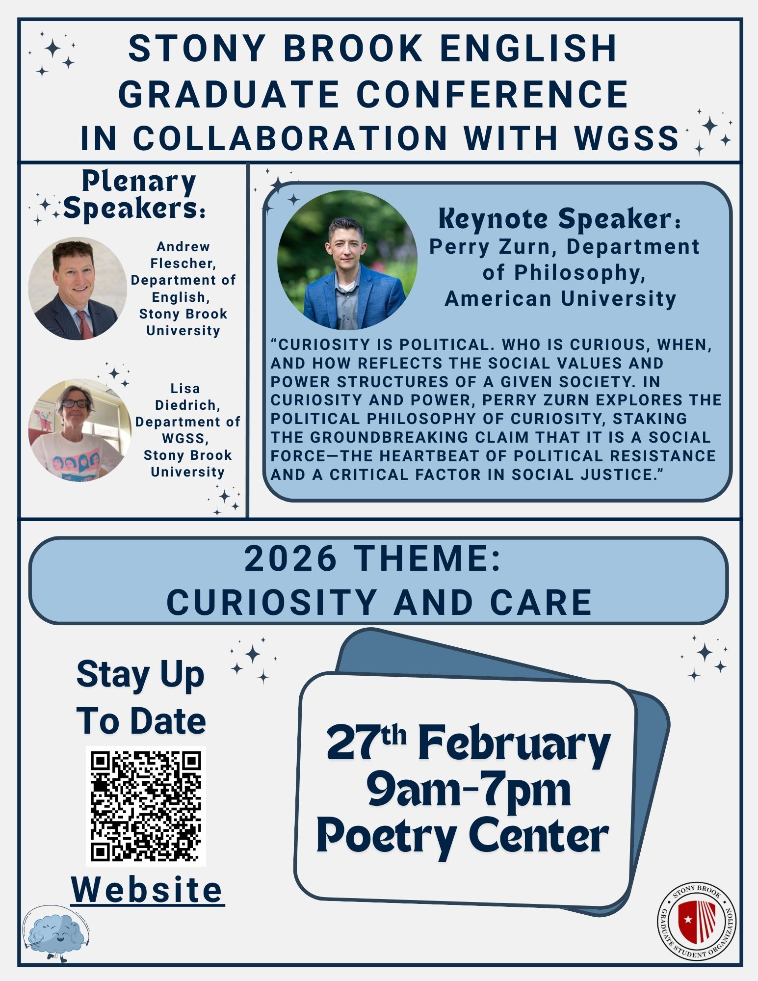 The graduate students in the Department of English at Stony Brook University have held an annual conference for thirty-seven years, making it one of the longest-running graduate student conferences in the country. The event features an open call for papers, inviting graduate students from across the U.S. to present their current research at Stony Brook. Organized into sets of concurrent panels with peer moderators and faculty respondents, the conference fosters meaningful dialogue between student presenters, faculty members, and peers from the English Department and other Humanities disciplines. A best paper prize is also awarded. By engaging departments across the Humanities and welcoming participants from graduate programs along the East Coast and beyond, the conference continues to serve as a vibrant space for scholarly exchange and outreach.