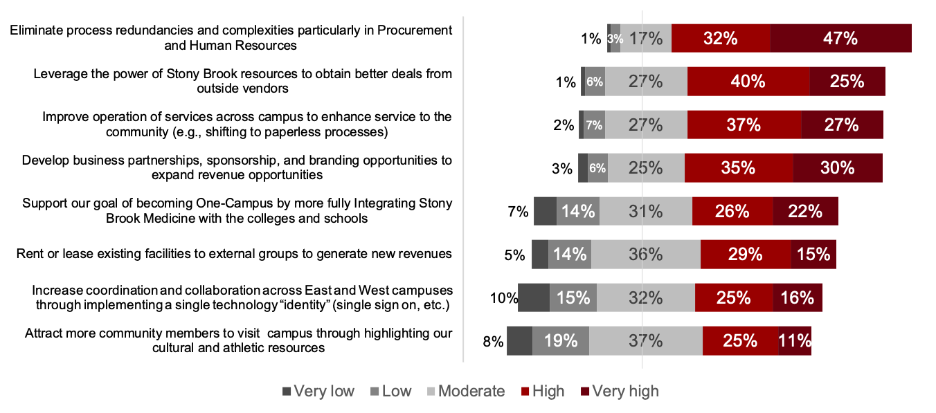Each taskforce identified a variety of potential opportunities with the goal to either increase revenue, reduce costs and increase efficiencies, or remove barriers to effective coordination and collaboration. Various working groups are now doing a deeper dive on many of these opportunities to understand the related costs, benefits and their overall viability. Faculty and staff were asked to rate the relative importance of these initiatives.
