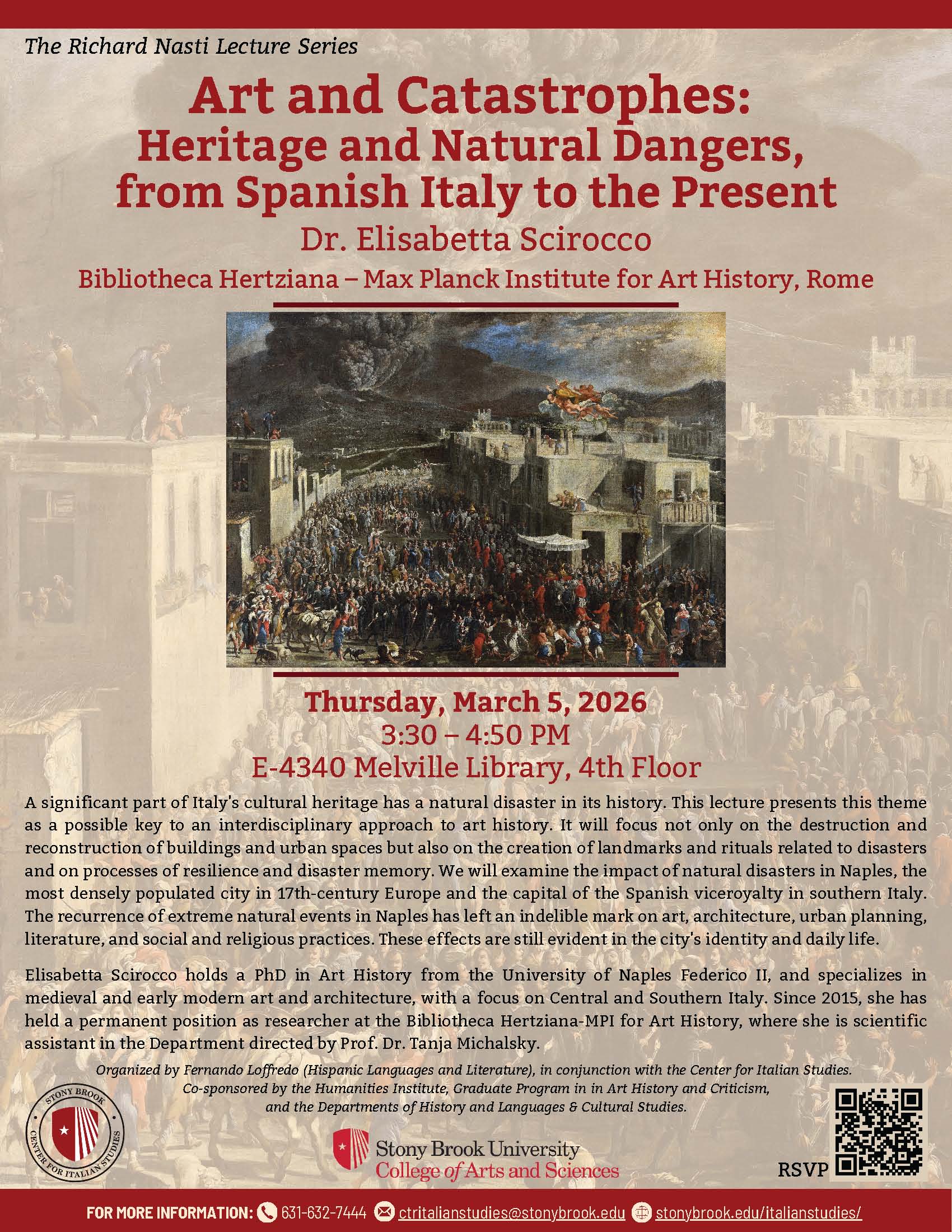 March 5 Talk by Prof. Elisabetta Scirocco (Max Planck Institute for Art History): "Art and Catastrophes." Thursday, March 5 from 3:30 to 4:50 pm in Javits 101. See poster.