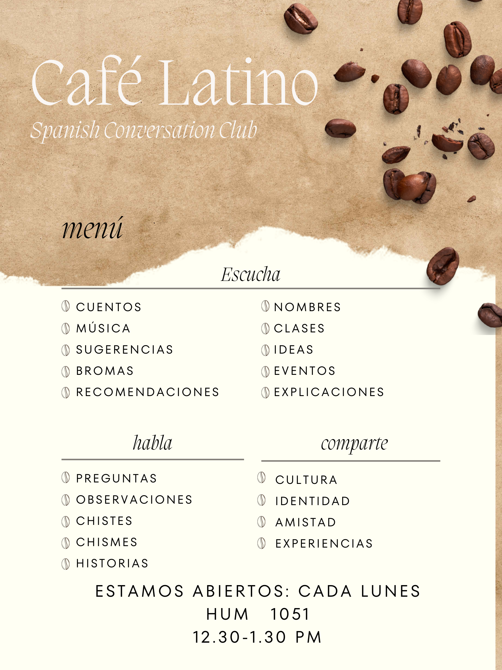 Café Latino on Mondays! Organized by Prof. Elena Davidiak. All Spanish levels are welcome. Come to our department, make friends and practice your Spanish with coffee or tea! See you on Mondays in HUM 1051 from 12.30 to to 1.30 pm.