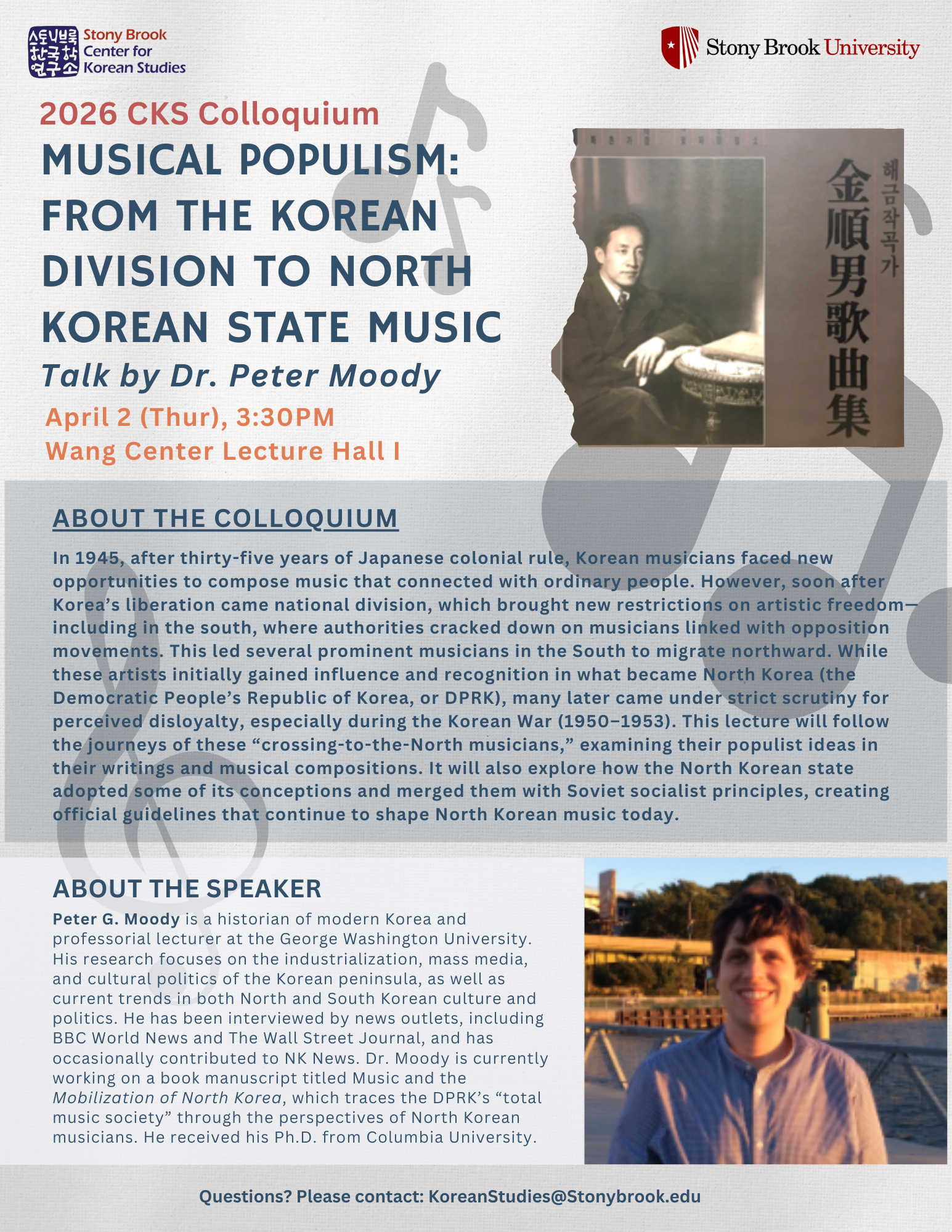 - April 2 CKS Colloquium: talk by Dr. Peter Moody (3:30 PM@Wang Center LH 1) "Musical Populism: from the Korean Dvision to North Korean State Music"
