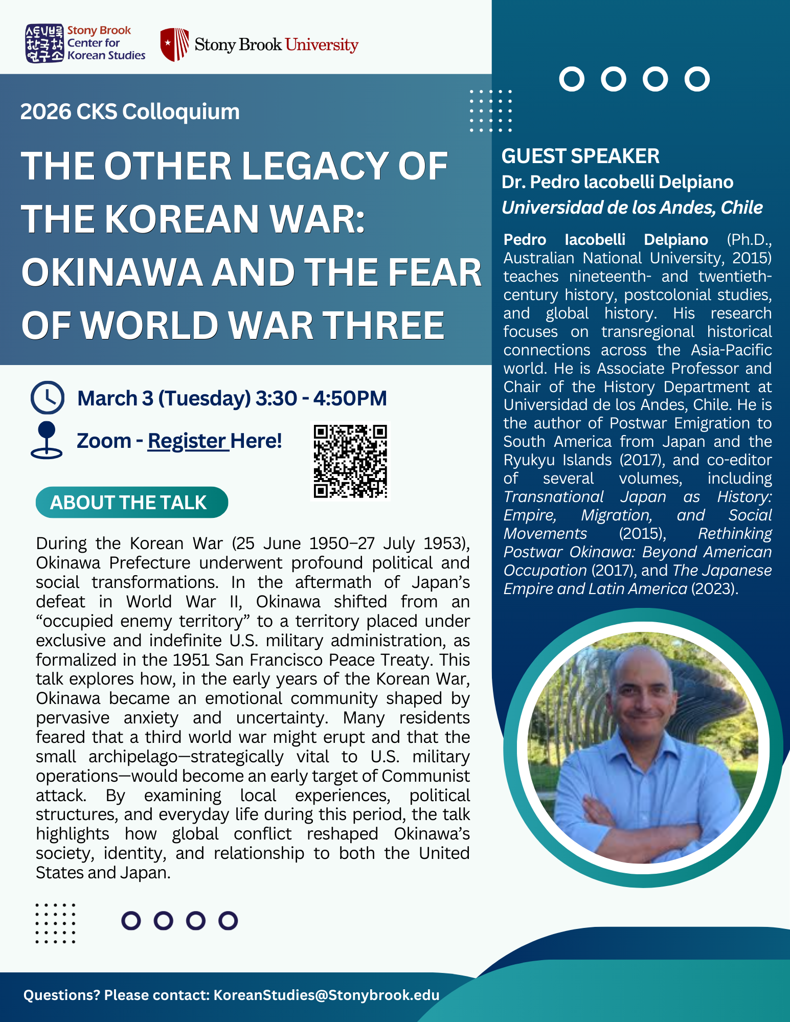 - March 2 CKS Colloquium: talk by Dr. Pedro Iacobelli Delpiano (3:30 PM, via Zoom) "The other legacy of the Korean War: Okinawa and the fear of World War Three"