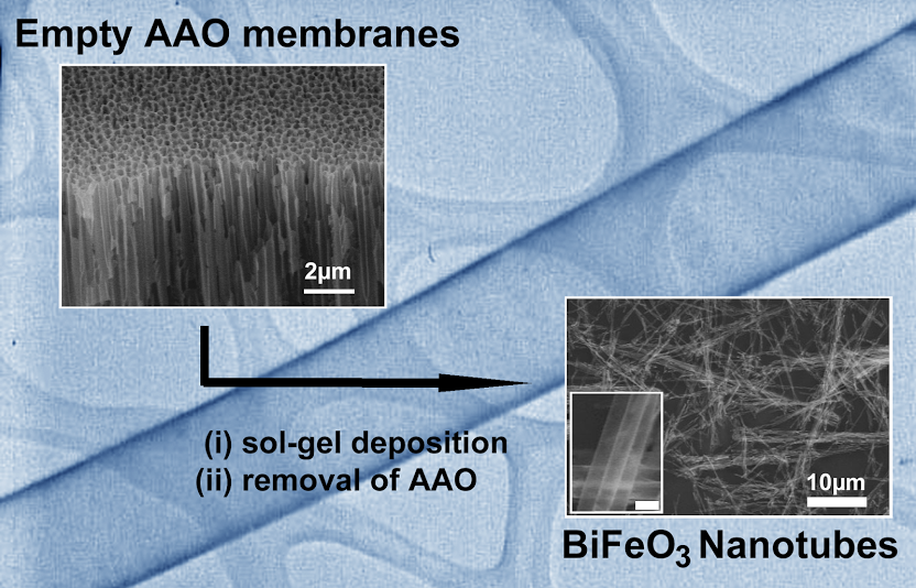 1. Generation and characterization of 1-D multiferroic BiFeO3 nanotubes (e.g., 100 and 200 nm diameter) using a pressure-filter variation of a template synthesis involving the sol-gel technique.